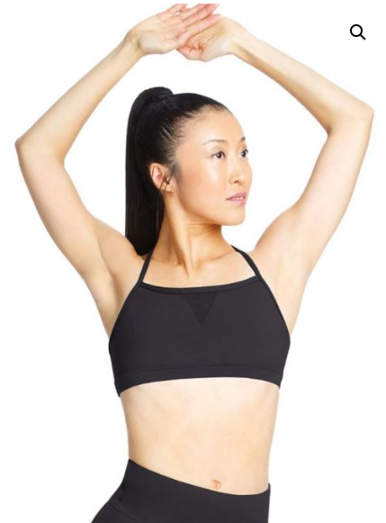 STRAPPY TECH BRA TOP, featuring a high scoop front, an open back with multiple crisscrossing straps, a triangular mesh detail for style, and bonded seams for a smooth fit under other layers. Made from a comfortable blend of polyester and spandex, it's a fitted, fully lined bra top designed for performance and layering in dance or activewear.