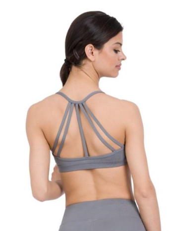 - Style: High scoop neck, open back with multiple straps, triangular mesh inset.